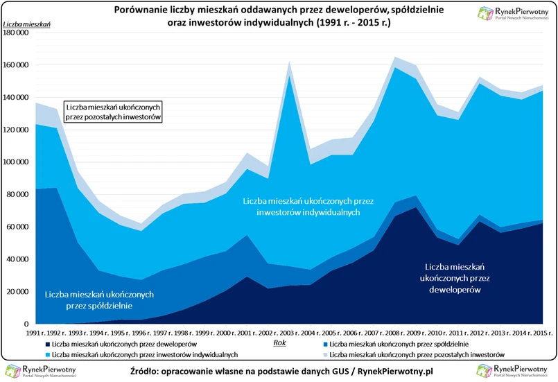 Przez ostatnie 25 lat, na krajowym rynku mieszkaniowym dokonały się bardzo istotne zmiany, po których największym przegranym są spółdzielnie. Jeszcze pod koniec lat 90 - tych, spółdzielczy inwestorzy oddawali do użytkowania około 30 000 mieszkań rocznie – tłumaczy Andrzej Prajsnar z portalu RynekPierwotny.pl. Szybko rozwijający się sektor deweloperski wówczas notował znacznie niższe wyniki. Kolejne lata przebiegały jednak pod znakiem intensywnego rozwoju „deweloperki” i regresu budownictwa spółdzielczego. W minionym roku, spółdzielczy inwestorzy oddali do użytkowania najmniej lokali od początku transformacji ustrojowej (2115 mieszkań). Analogiczny wynik deweloperów był prawie trzydzieści razy wyższy. W tym kontekście warto nadmienić, że statystyki sektora deweloperskiego poprawiają spółdzielnie, które zrezygnowały z budowania „M” tylko dla swoich członków i sprzedają lokale na wolnym rynku. Działalność takich podmiotów jest szczególnie widoczna na terenie Warszawy i Krakowa.