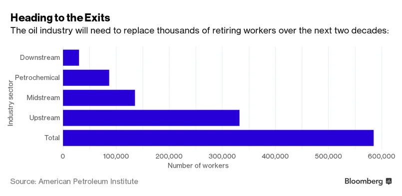 Sektor naftowy zdaje sobie sprawę, że bardzo wyraźny odsetek osób zatrudnionych przy wydobyciu surowca zbliża się do wieku emerytalnego. Ich miejsce mają zastąpić młode osoby spoza branży (poddawane specjalnym szkoleniom) oraz przedłużający swoje kariery zawodowe weterani. Kryzys dławiący amerykański sektor wydobywczy zmusił firmy do zwolnienia tysięcy pracowników, jednak unikają one pozbywania się trudno zastępowalnych naukowców i inżynierów.