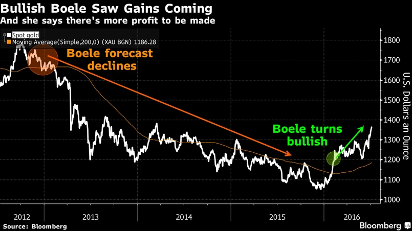 Na początku 2013 roku Boele znajdowała się wśród najbardziej „niedźwiedzio” nastawionych wobec złota analityków, kiedy surowiec doświadczył pierwszego rocznego spadku od 13 lat. Obstawiała też obniżkę cen na kilka miesięcy przed tym, jak cena surowca spadła w grudniu do 5-letniego minimum. Pomimo rynkowych niepokojów wywołanych Brexitem złoto znajduje się obecnie w okolicach 2-letniego maksimum.