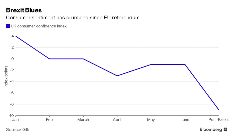 - Sprzedaż sklepów otwartych od co najmniej roku spadła w zeszłym miesiącu o 3,6 proc., a tygodniowe dane wskazują na stopniowe pogarszanie się sytuacji – wynika z danych przedstawionych przez firmę BDO. Inny raport sporządzony przez GFK wskazuje natomiast na osłabienie zaufania brytyjskich konsumentów od momentu ogłoszenia wyników głosowania.
