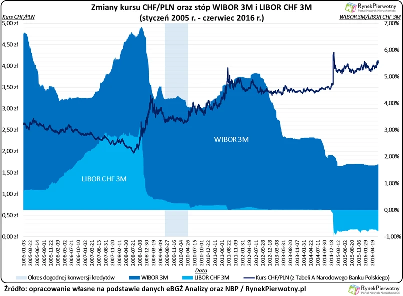 Warto zwrócić uwagę, że od sierpnia 2009 r. do kwietnia 2010 r. notowania szwajcarskiej waluty ustabilizowały się na poziomie 2,65 zł - 2,85 zł (kurs NBP z Tabeli A). Różnica stopy referencyjnej dla kredytów rozliczanych w złotym (WIBOR 3M) oraz franku szwajcarskim (LIBOR CHF 3M), nie zachęcała wówczas do konwersji długu. Z perspektywy czasu okazało się jednak, że taki krok po pierwszej znaczącej aprecjacji CHF, wcale nie był złym wyborem.