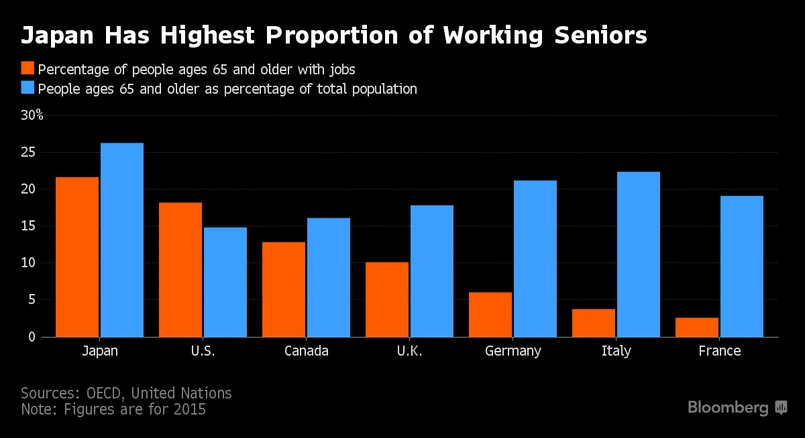 Spośród wszystkich państw rozwiniętych to Japonia ma największy odsetek pracujących seniorów. Liczba zatrudnionych osób w wieku powyżej 65 roku urosła w 2015 roku do 7,3 mln (21,7 proc. osób należących do tej grupy wiekowej). To jednak nie wystarczy na pokrycie niedoborów siły roboczej. Według szacunków Japan Institute for Labor Policy and Training liczba pracowników zmniejszy się do 2030 roku z 64 do 56 mln.