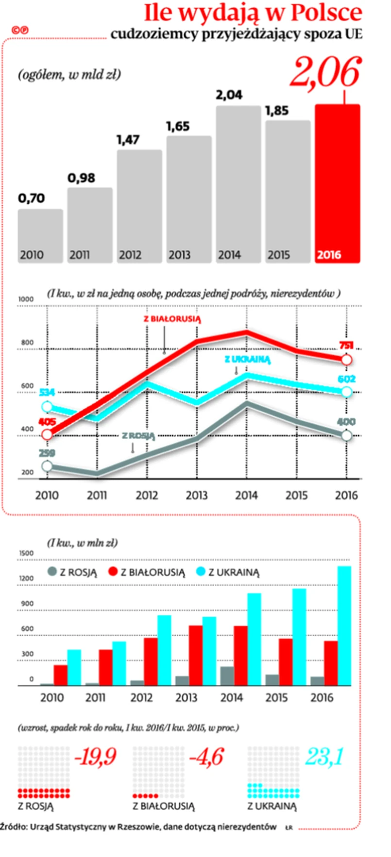 Według szacunków urzędu goście z Rosji, Białorusi i Ukrainy wydali od stycznia do końca marca w naszych sklepach, restauracjach, w hotelach, na bazarach i w różnych punktach usługowych prawie 2,1 mld zł – o 11,6 proc. więcej niż przed rokiem.