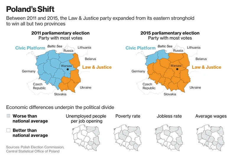 W wyborach parlamentarnych w 2015 roku PiS zwyciężył w niemal wszystkich polskich województwach. Jeszcze w 2011 roku popierała go głównie polska ściana wschodnia.