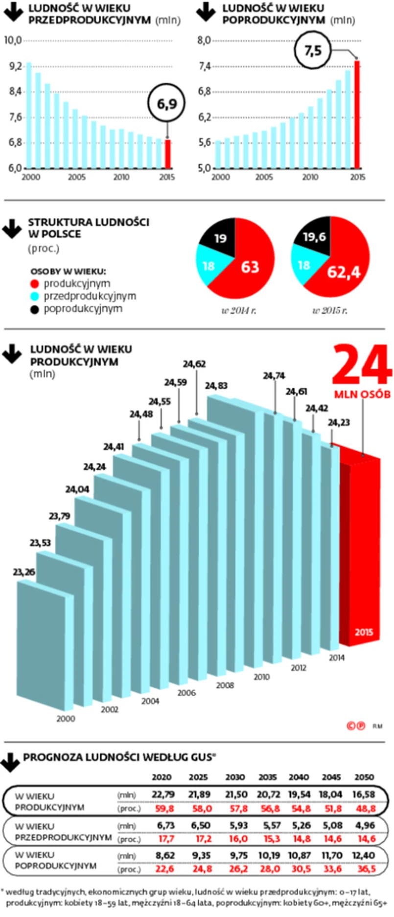 Pod koniec 2015 r. w naszym kraju były 24 mln osób w wieku produkcyjnym. Ich liczba zmniejszyła się w porównaniu z poprzednim rokiem o 228 tys. Był to największy spadek od pięciu lat, czyli od momentu, w którym ten wskaźnik zaczął spadać. W rezultacie w całym tym okresie liczba osób w wieku produkcyjnym zmalała o 829 tys. Natomiast ich udział w ogólnej liczbie ludności naszego kraju zmniejszył się o 2 pkt proc. do 62,4 proc.