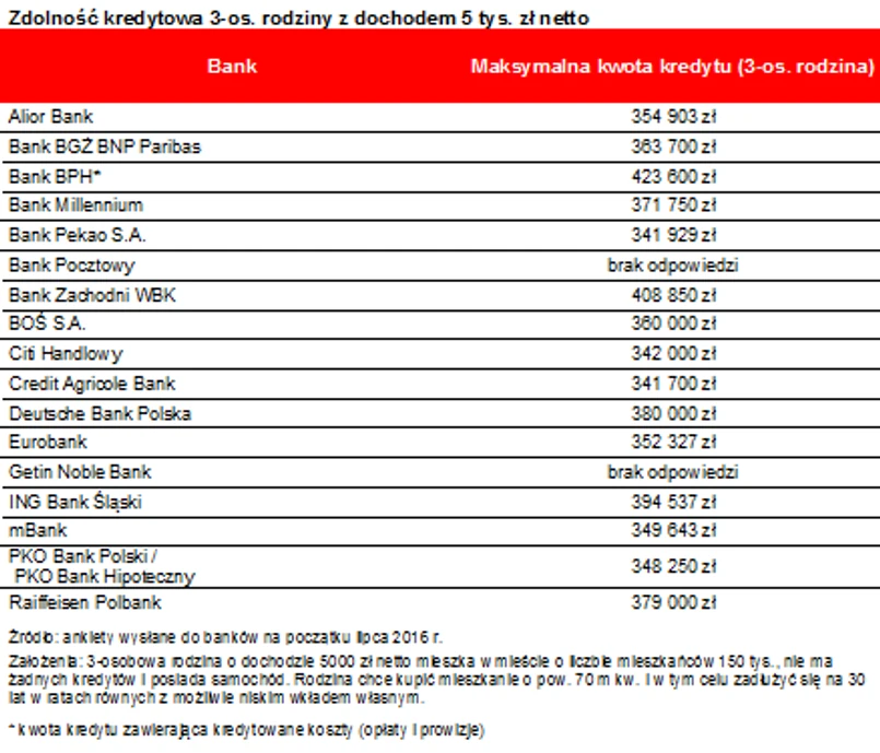 Co należy podkreślić, w czerwcu modelowa rodzina nie miała co liczyć na pożyczenie na mieszkanie pół miliona złotych. Taka sztuka przy zarobkach 5 tys. zł miesięcznie możliwa była w 2015 roku nawet w 4-5 instytucjach. Dziś takiej kwoty nie pożyczy już żaden z przebadanych banków. Najwięcej modelowej rodzinie pożyczyć chciałyby BPH i BZ WBK. Tylko te dwie instytucje deklarują, że rodzina zarabiająca co miesiąc 5 tys. zł netto może liczyć na ponad 400 tys. zł długu.