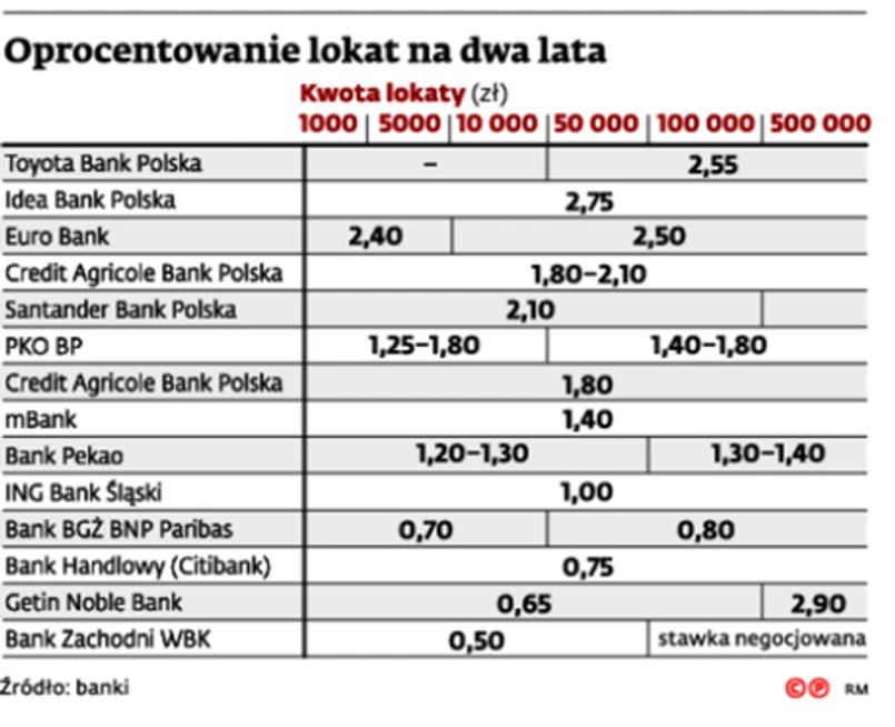 Do grupy instytucji, które nie posiadają lokat na dwa lata, należą Deutsche Bank Polska, Bank Polskiej Spółdzielczości, Bank Pocztowy czy Raiffeisen Bank Polska. Z kolei w Toyota Bank Polska, żeby zacząć oszczędzać na tak długi termin, trzeba zdeponować przynajmniej 13 tys. zł.