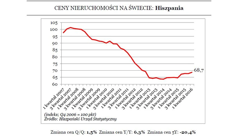 Najnowszy odczyt mówi, że w II kwartale br. ceny hiszpańskich nieruchomości były o ponad 0,8% wyższe (po uwzględnieniu inflacji o 2% wyższe), niż w analogicznym okresie rok wcześniej. Jeszcze bardziej optymistyczne dane podaje Hiszpański Urząd Statystyczny. Ten szacuje, że w I kwartale br. ceny nieruchomości były na poziomie aż o 6,3% wyższym (realnie) niż rok wcześniej.