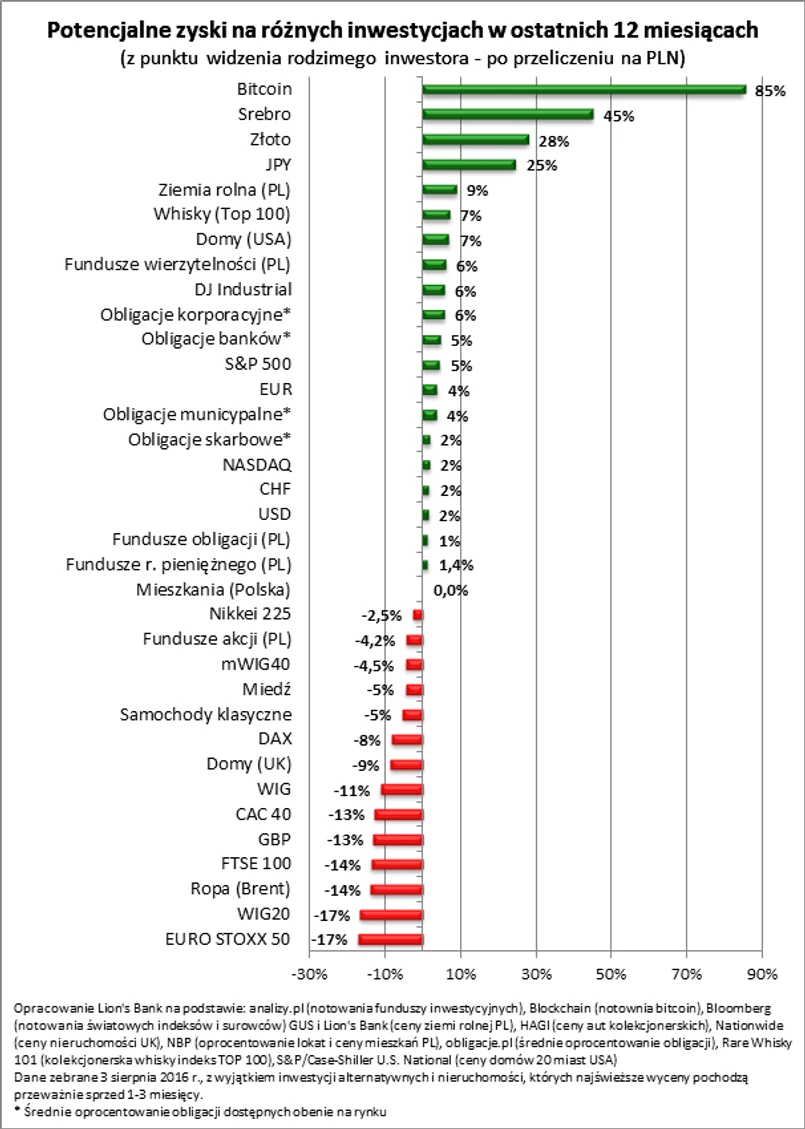 Skoro mowa już o inwestowaniu w żółty kruszec, to ostatnie 12 miesięcy były dla jego posiadaczy bardzo dobre. Złoto zdrożało z punktu widzenia rodzimego inwestora o 28%. Za takim wynikiem stoją: niepewność, „dodruk” pieniądza przez największe banki centralne, zerowe stopy procentowe, a także wspomniane wcześniej referendum, w którym Brytyjczycy opowiedzieli się za wyjściem z Unii.