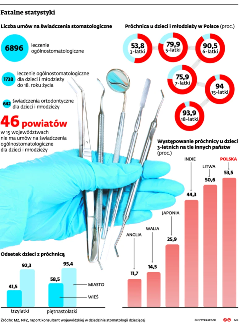 Z ostatniego raportu konsultanta w dziedzinie stomatologii dziecięcej na zlecenie Ministerstwa Zdrowia wynika, że ponad połowa 3-latków i 94 proc. 15-latków ma próchnicę. W tej ostatniej grupie aż 5 proc. nie ma już co najmniej jednego zęba.