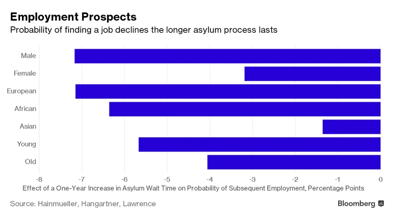 Z badania, którego wyniki zostały opublikowane w czasopiśmie Science Advances, wynika, że szanse na znalezienie zatrudnienia przez uchodźcę maleją z każdym miesiącem oczekiwania przez niego na otrzymanie prawa do azylu. Zostało ono przeprowadzone na 17 tys. osób starających się o azyl w Szwajcarii w latach 1994-2004 i pochodzących z takich państw jak Serbia, Somalia oraz Irak.