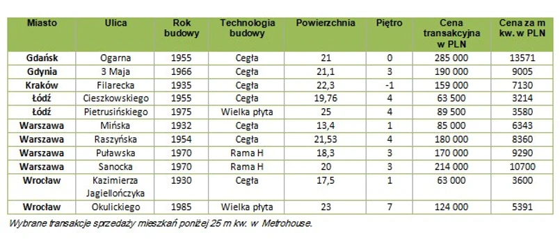 Podaż mieszkań o powierzchni do 25 m kw. w zależności od lokalizacji wynosi zwykle zaledwie 2-3 proc. Popyt na takie mieszkania jest dość znaczny, o czym świadczy fakt, że pomimo tak niszowego segmentu ich udział w transakcjach Metrohouse wynosi 5 proc. – Wśród mikromieszkań przeważają oferty w kamienicach, które niejednokrotnie powstały w ramach podziału dużych, budowanych jeszcze przed wojną mieszkań. Część ofert wystawionych do sprzedaży stanowią lokale w budynkach wybudowanych w latach 70-tych i to one są najtańsze w tej grupie, mówi Marcin Jańczuk z Metrohouse.