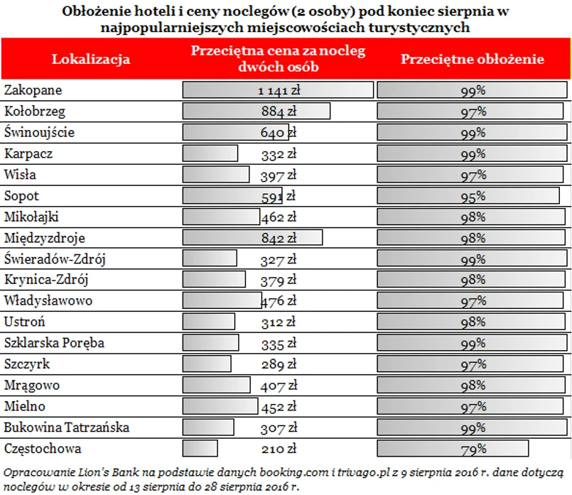Pozostaje więc spytać z jaką ofertą spotka się para, która planując urlop na ostatnią chwilę, chciałaby wyjechać 13 sierpnia i wrócić 28 sierpnia? Niestety w wielu miejscach trudno mówić o jakiejkolwiek ofercie, bo w hotelach nie ma już przeważnie wolnych miejsc. W 18 popularnych turystycznie miastach przeciętne obłożenie wynosi aż 97% - wynika z danych zebranych przez Lion’s Bank na internetowych portalach rezerwacyjnych. To oznacza, że niewynajęte są wciąż trzy miejsca noclegowe na 100. W praktyce sytuacja jest znacznie gorsza, bo może się okazać, że para w trakcie dwutygodniowego urlopu musiałaby się nawet kilka razy przeprowadzać pomiędzy hotelami lub przynajmniej pomiędzy pokojami w tym samym hotelu. Gdyby tego było mało, na najemców czekają przeważnie jedynie najdroższe oferty. W efekcie wakacyjny szał podniósł w tym roku koszt noclegów modelowej pary o ponad 1500 zł.