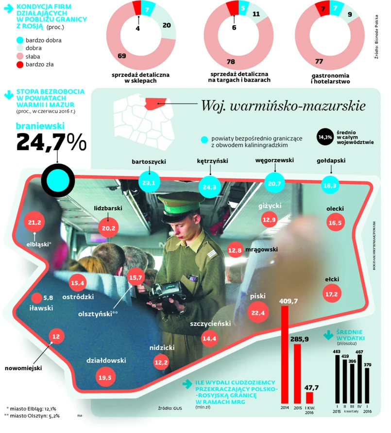 Nasza rozmówczyni mówi, że na zawieszeniu MRG ucierpi większość handlowców i usługodawców z Bartoszyc i okolic. – Niemal wszyscy drobni handlowcy i rzemieślnicy korzystali z obecności Rosjan – ocenia wiceburmistrz. Michał Krasiński, wicestarosta powiatu kętrzyńskiego, zwraca uwagę, że ze swobodnego przekraczania granicy korzystali nie tylko przedsiębiorcy sprzedający swój towar i usługi Rosjanom, ale również polscy konsumenci. – Choćby tankując swoje samochody na rosyjskich stacjach. Bezpieczeństwo jest bardzo ważne, ale o aspektach ekonomicznych też nie możemy zapominać. Z tego punktu widzenia mały ruch graniczny zrobił dużo dobrego w powiatach przygranicznych – mówi Michał Krasiński.