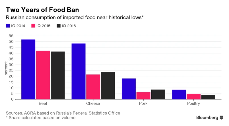 I tak decyzją prezydenta Władimira Putina, od sierpnia 2014 roku rosyjski rynek został odcięty od zachodnich smakołyków, począwszy od francuskiego sera brie i camembert, skończywszy na norweskim łososiu. Ale, że rynek nie znosi pustki, brak tych towarów wykorzystały lokalne firmy. Według danych ACRA konsumpcja spożywczych produktów zagranicznych w Rosji jest obecnie prawie na najniższych poziomach w historii.