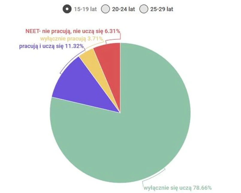 We wszystkich grupach wiekowych jest część osób biernych społecznie, które nie przejawiają jakiejkolwiek aktywności zawodowo-edukacyjnej, ani się nie uczą, ani nie pracują i pozostają na utrzymaniu rodziców. Grupę tych osób opisuje wskaźnik NEET, czyli młodzież bez pracy, nauki czy szkolenia (NEET z ang.: not in employment, education or trainings). Patrząc na dane widać, że odsetek młodych z grupy NEET znacznie zwiększa się wraz z wiekiem. W 2015 roku w grupie wiekowej 15-19 lat stopa NEET wyniosła tylko 6,3 proc. Dla grupy wiekowej 20-24 lat wskaźnik wzrósł prawie trzykrotnie do 17,3 proc. Natomiast wśród osób w wieku 25-29 lat w grupie NEET był prawie co piąty Europejczyk – wskaźnik wynosił 19,7 proc..