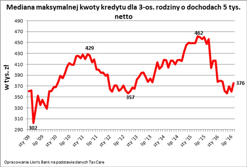 Trzyosobowa rodzina dysponująca dochodem na poziomie 5 tys. zł netto może pożyczyć niecałe 376 tys. zł (mediana) w formie 30-letniego kredytu – wynika z najnowszych danych zebranych przez Lion’s Bank. Wynik ten jest wyższy niż przed miesiącem (o 16 tys. zł), ale w ciągu roku zdolność kredytowa modelowej rodziny spadła o ponad 70 tys. zł.