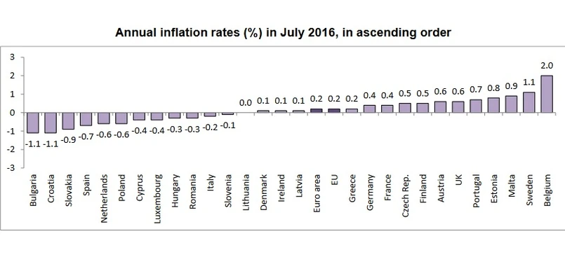 Inflacja HICP w strefie euro wyniosła w lipcu 0,2 proc. rok do roku wobec 0,1 proc. rok do roku miesiąc wcześniej, podał unijny urząd statystyczny Eurostat.