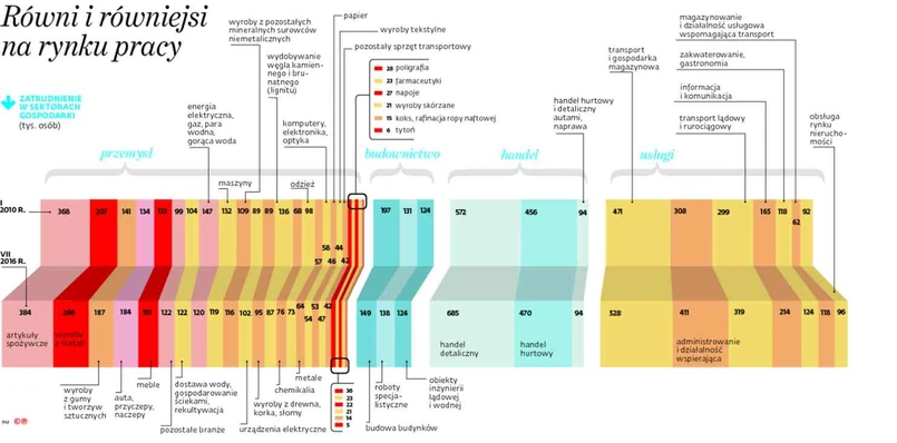Przegrani to górnicy i budowlańcy. W górnictwie liczba pracujących spadła od początku 2010 r. o jedną trzecią, do 87 tys. W budownictwie spadek wyniósł niespełna 9 proc., ale w firmach, które zajmują się wznoszeniem budynków, było to niemal 25 proc. Częściowo można to tłumaczyć rosnącym udziałem szarej strefy i przechodzeniem z umów o pracę, np. na zlecenia. Chociaż górnictwo wciąż należy do najlepiej wynagradzanych branż, to wzrost wynagrodzeń w ostatnich sześciu latach niewiele przekroczył tam 20 proc., a więc był stosunkowo niski. Budowlanka wypada jednak zdecydowanie gorzej: między 2010 a 2016 r. przeciętna płaca zwiększyła się tam o 14 proc.