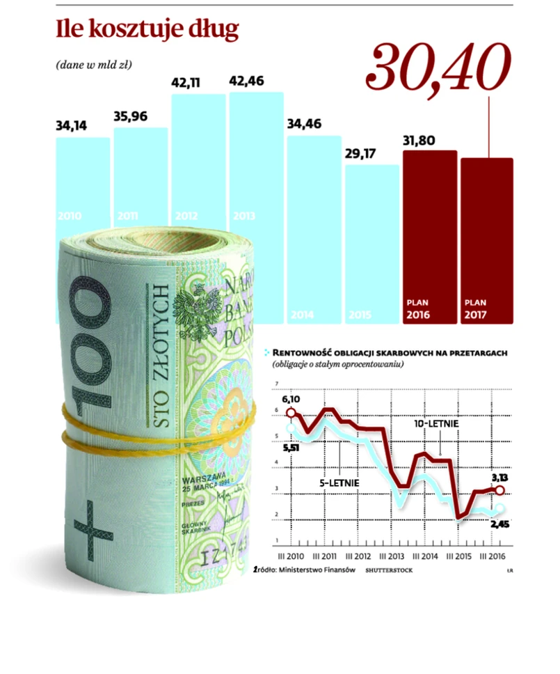 Drugi czynnik ryzyka to sytuacja w kraju. Budżet na 2017 r. jest bardzo napięty, MF zapisało w nim około 10 mld zł dodatkowych dochodów z poprawy ściągalności podatków. To prognoza obarczona dużym ryzykiem i dziś nie do zweryfikowania. Resort za podstawę do wyliczenia planu dochodów przyjął też dość optymistyczne założenie wzrostu gospodarczego w przyszłym roku (3,6 proc.). Zdaniem specjalistów kłopoty z wykonaniem budżetu będą się przekładać na wzrost premii za ryzyko, żądanej przez kupujących obligacje.