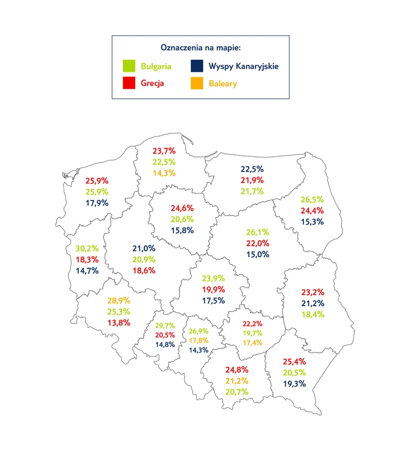 Wczasy w Grecji najczęściej spędzają mieszkańcy województwa świętokrzyskiego, pomorskiego, kujawsko-pomorskiego, lubelskiego, podkarpackiego i Małopolski. Wyspy kanaryjskie to ulubiona destynacja Polaków mieszkających w Wielkopolsce i w województwie warmińsko mazurskim, a Baleary, czyli Majorka, Minorka i Ibiza to zdecydowany numer jeden na dolnym śląsku.