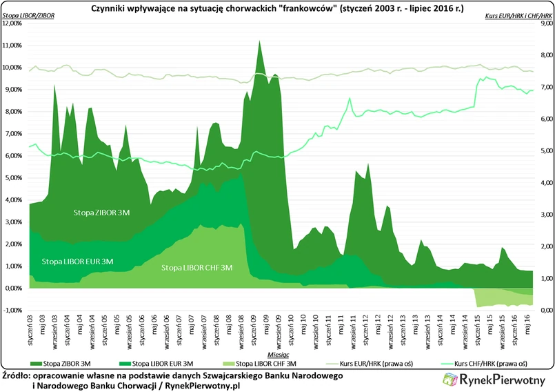 Niezależnie od przetasowań politycznych i ostrzeżeń banków oraz Komisji Europejskiej, byli chorwaccy „frankowcy” mogą spać spokojnie. Trudno sobie wyobrazić odwrócenie przewalutowania, z którego skorzystało 55 000 gospodarstw domowych. Tym osobom rząd zaoferował konwersję zadłużenia z franków na euro. Wspomniana operacja została przeprowadzona przy zastosowaniu kursów z dnia zawarcia umowy kredytowej i historycznej marży dla „eurowych” kredytów. Ewentualne nadpłaty byłych „frankowców”, zaliczono na poczet przyszłych rat. Potraktowanie „frankowego” kredytu jako zobowiązania pierwotnie rozliczanego w euro, nie usuwa ryzyka walutowego dla tysięcy Chorwatów, ale ma pewne ekonomiczne uzasadnienie. Warto odnotować, że stopa referencyjna dla kredytów w rodzimych kunach (ZIBOR), nadal pozostaje znacznie wyższa od analogicznej stawki dotyczącej euro (LIBOR EUR). Różnica widoczna na poniższym wykresie nie jest tak duża, jak w czasach mieszkaniowego boomu (lata 2003 – 2008), ale nadal mogłaby mieć znaczenie dla kredytobiorców. O wyborze chorwackiego rządu, zadecydowała również wieloletnia stabilność kursu EUR/HRK. Chorwacja jako kraj aspirujący do Strefy Euro i cel wypraw turystycznych dla mieszkańców Zachodniej Europy, już od lat stara się utrzymywać nieoficjalny parytet wynoszący 7,5 HRK za 1,0 EUR.