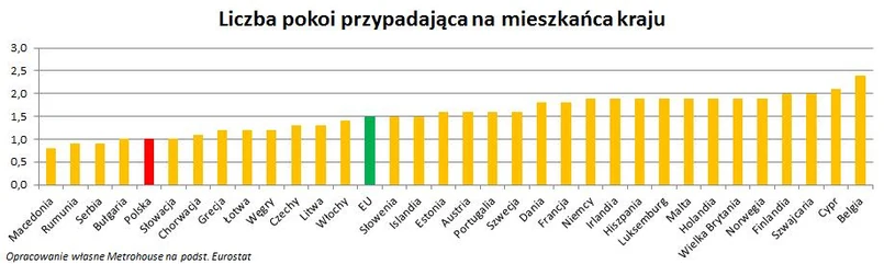 Dane Eurostatu dotyczą mieszkań własnościowych znajdujących się w budynkach wielorodzinnych, a więc w popularnych blokach i kamienicach (bez mieszkań wynajmowanych). Średnia dla całej Unii Europejskiej wynosi 1,5 pokoju na osobę. W najlepszej sytuacji są mieszkańcy Belgii, gdzie na jedną osobę przypada 2,4 pokoju. Bardzo dobre warunki mieszkaniowe są także na Cyprze (2,1) i w Finlandii (2). Na samym końcu europejskich statystyk znajduje się Macedonia (0,8), Serbia i Rumunia (po 0,9). Polska ex aequo z Bułgarią i Słowacją zajmuje kolejne od końca miejsce. Na jednego mieszkańca tych państw przypada 1 pokój w mieszkaniu.