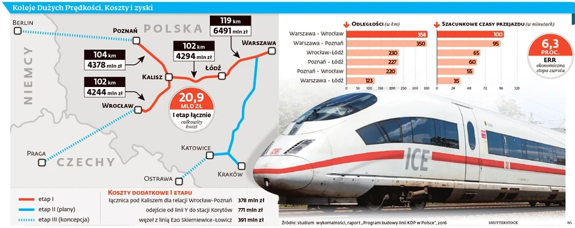 Bo będą powoli kończyły się możliwości skokowego skrócenia czasu przejazdu między regionami Polski. Np. modernizacja linii kolejowej Swarzędz – Sochaczew za 2,6 mld zł, która skróci czas przejazdu raptem o kilkanaście minut. Efekty zmodernizowanej linii E65 Warszawa – Gdynia też nie powalają, jeśli weźmiemy pod uwagę koszt: ok. 10 mld zł. W przypadku KDP mówimy o czasie przejazdu z Warszawy do Poznania 1 godz. 35 min zamiast obecnych 2 godz. 26 min. A np. Warszawa – Wrocław: z obecnych 3 godz. 41 min do 1 godz. 40 min. ⒸⓅ