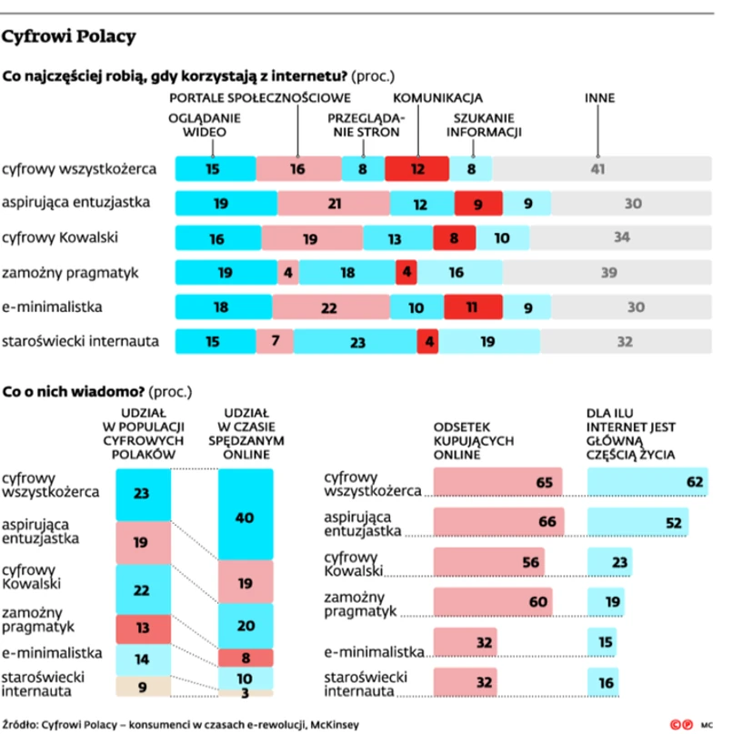 Internauta internaucie nierówny. Statystycznie każdy spędza w sieci już sześć godzin dziennie, 90 proc. korzysta z WiFi w domu, to jednak – jak wynika z najnowszego raportu „Cyfrowi Polacy – konsumenci w czasach e-rewolucji” wśród użytkowników internetu wyłania się kilka grup. Analitycy McKinsey & Company wymieniają sześć najbardziej charakterystycznych. Płeć poszczególnych grup nie jest przypadkowa – jest odzwierciedleniem tego, czy mężczyźni, czy kobiety stanowią w niej większość.