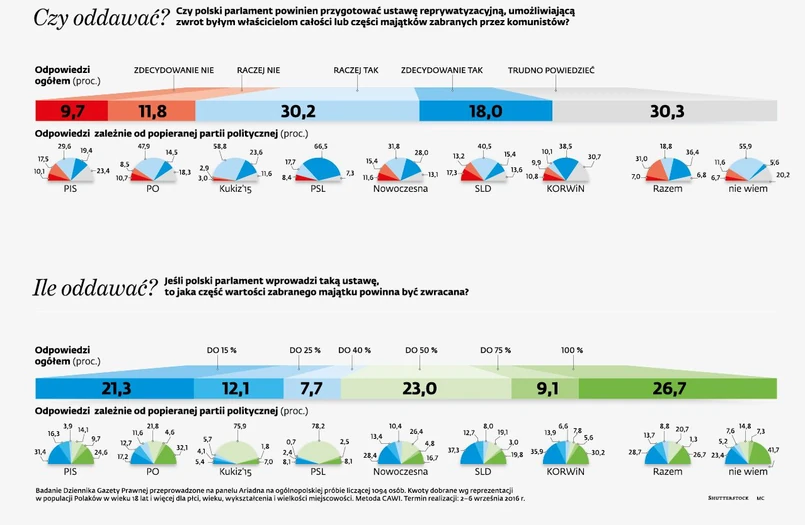 Na razie droga do tego daleka. PO zgłosiła projekt ustawy reprywatyzacyjnej, ale dotyczy on tylko Warszawy. PiS zajął wyczekującą postawę. Choć nie wyklucza przygotowania własnego projektu, to na razie czeka na rozwój wypadków. Jak pokazuje nasz sondaż, postulat zwrotu w całości lub części majątków byłym właścicielom ciszy się największym poparciem wśród elektoratu Kukiz 15 , popiera go ponad 80 proc zwolenników tej partii, pomysł popularny jest także wśród wyborców PO, PSL czy Nowoczesnej.