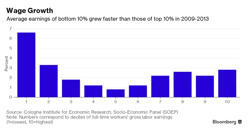 Po uszeregowaniu i podziale pracowników na 10 grup w zależności od wysokości wynagrodzenia, okazało się, że w latach 2009-2013 płace osób z 10-procentowej grupy najmniej uposażonych rosły znacznie szybciej niż pracowników z grupy najlepiej zarabiających. Oznacza to, że nierówność w zarobkach w Niemczech w ciągu ostatniej dekady - zamiast zgodnie z powszechnym przekonaniem zwiększać się - faktycznie pozostała mniej więcej na takim samym poziomie. W ocenie ekonomistów z Instytutu Badań Ekonomicznych w Kolonii do wzmocnienia tego trendu mogło przyczynić się wprowadzenie w Niemczech, od stycznia 2015 r., płacy minimalnej na poziomie 8,50 euro na godzinę.