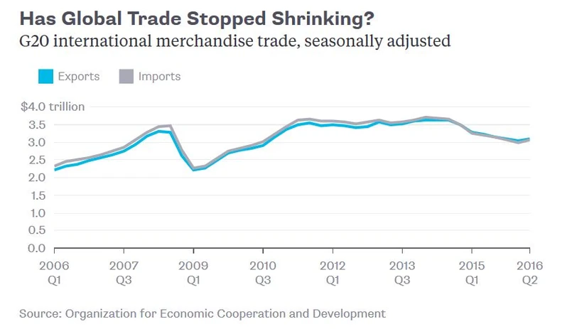 Po raz pierwszy od początku 2014 roku wartość importu i eksportu dóbr (liczona w dolarach) w ramach grupy G20 w drugim kw. 2016 roku wzrosła bardzo nieznacznie – wynika z najnowszych danych Organizacji Współpracy Gospodarczej i Rozwoju (OECD). Prawdopodobnie to efekt lekkiego odbicia na rynku ropy po tym, jak cena surowca zanotowała w pierwszym kwartale 2016 roku 12-letnie minimum.
