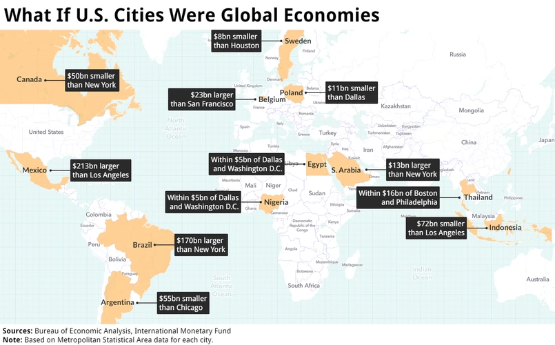 Aby lepiej zobrazować wielkość gospodarek amerykańskich metropolii, Bloomberg porównał je do wybranych państw na świecie. I tak gospodarka Kanady jest o ok. 50 mld dol. mniejsza niż gospodarka samego Nowego Jorku. Meksyk jest tylko o 213 mld dol. większy niż Los Angeles, a PKB Belgii zaledwie o 23 mld dol. większy niż San Francisco. Wartość polskiej gospodarki (474,8 mld dol. w 2015 roku) jest o 11 mld dol. mniejsza niż PKB Dallas, a Szwecji brakuje 8 mld dol., by dogonić Houston.