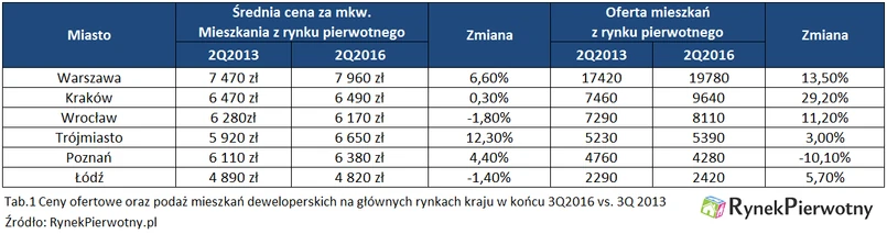 Dwucyfrowy procentowo wzrost zanotowano jedynie w Trójmieście, następnie blisko 7-procentowy w Warszawie. Stołeczne stawki poszły jednak w górę głównie za sprawą wprowadzenia oferty Złotej 44. W sumie średnia nieważona wolumenem cena mkw. mieszkań z sześciu głównych rynków mieszkaniowych kraju od początku boomu w połowie 2013 roku do połowy roku bieżącego wzrosła o zaledwie 3,6 proc., co daje około 1 proc. zwyżki rocznie. Za to oferta mieszkań deweloperskich, wynosząca dziś w sumie na omawianych rynkach około 50 tys. lokali, zwiększyła się o prawie 12 proc.
