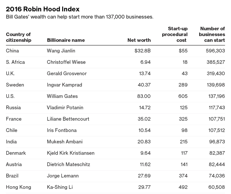 Bloomberg przeanalizował wartość majątku najbogatszych ludzi świata w 42 państwach o różnych systemach politycznych i odmiennych uwarunkowaniach prawnych dla biznesu i porównał ją z kosztami założenia małej lub średniej wielkości firmy w danym kraju.