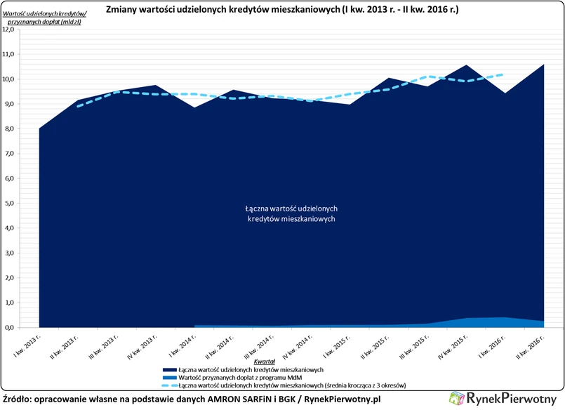 Krajowy rynek kredytów hipotecznych już od dłuższego czasu cechuje się dość widoczną sezonowością. Przez ostatni rok wahania wartości nowych „hipotek”, były spowodowane również zmianami w programie MdM. Banki odczuły napływ wniosków kredytowych, gdy została wprowadzona możliwość dotowania używanych lokali oraz domów i zwiększyło się dofinansowanie dla części rodzin – tłumaczy Andrzej Prajsnar z portalu RynekPierwotny.pl. Wpływ tego czynnika był widoczny w IV kw. 2015 r. Kolejny napływ wniosków o kredyt z dopłatą, poprawił wyniki sprzedażowe banków z II kw. 2016 r. Jeżeli poprzez zastosowanie tzw. średniej kroczącej wygładzimy wykres z jednorazowych wahań, to można lepiej zauważyć wzrostowy trend w wartości nowych „hipotek” po IV kw. 2014 r.