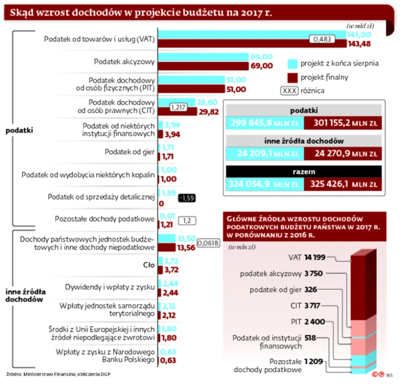 Projekt ustawy budżetowej na 2017 r. trafił już do Sejmu. Wkrótce prace nad nim zaczną posłowie. Dokument przyjęty przez rząd w minioną środę różni się nieco od wstępnego projektu, który został zaakceptowany przez Radę Ministrów pod koniec sierpnia. Wtedy szacowano, że dochody państwa wyniosą w przyszłym roku niemal 324,1 mld zł. W ostatecznej wersji kwota ta wzrosła do 325,4 mld zł.