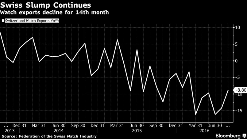 Spowalniający eksport zmusił producenta takich luksusowych marek jak Cartier oraz IWC Schaffhausen firmę Cie. Financiere Richemont SA do zwolnień, odkupienia niesprzedanych zapasów od detalistów oraz skoncentrowania się na bardziej przystępnych produktach. Richemont ostrzegł, że zysk firmy spadnie w pierwszej połowie roku o 45 proc., podobnie jak stało się w przypadku innego producenta czasomierzy Swatch Group AG (spadek zysków o 54 proc.).