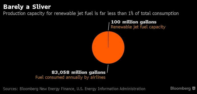Przemysł biopaliw ma obecnie możliwość wyprodukowania 100 milionów galonów (378 mln litrów) biopaliwa przeznaczonego do samolotów rocznie - powiedział Claire Curry, analityk Bloomberg New Energy Finance. – Linie lotnicze zużywają ponad 83 miliardy galonów rocznie – dodał.