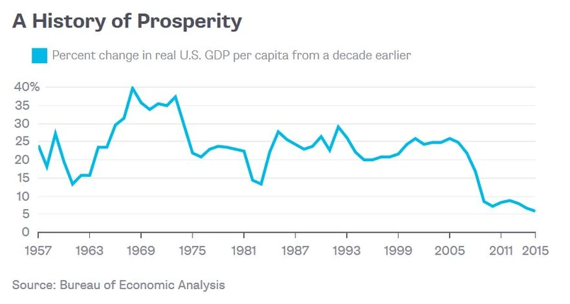 3. Z kolei skumulowany wzrost PKB na mieszkańca w latach 2005-2015 był najniższy w branym pod uwagę okresie, czyli w tym przypadku od 1966 roku. Zasadniczo wyjaśnia to, dlaczego tak wielu Amerykanów nie jest zadowolonych z wyników gospodarczych USA w ostatnich latach.