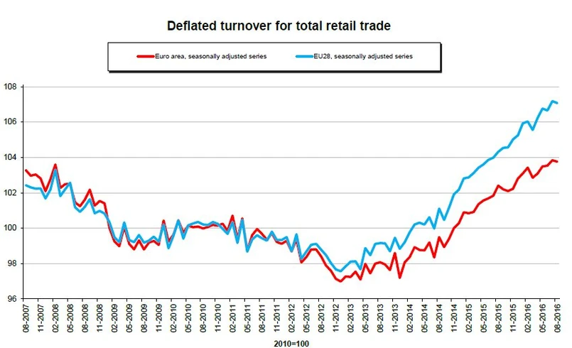 W całej Unii Europejskiej sprzedaż detaliczna spadła o 0,1 proc. w ujęciu miesięcznym, zaś w ujęciu rocznym wzrosła o 2,1 proc. rok do roku.