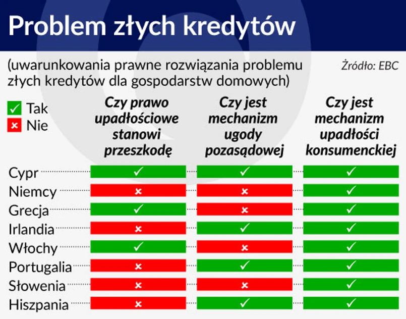 Według niedawno ogłoszonej analizy EBA na koniec marca tego roku NPL stanowiły 5,7 proc. należności banków w Unii. Z pozoru wskaźnik ten nie wydaje się porażający. To tylko jednak pozory, bo gdy weźmiemy pod uwagę, że w krajach najbardziej dotkniętych przez kryzys (Cypr, Grecja, Hiszpania, Irlandia, Portugalia, Słowenia i Włochy) w bilansach grup bankowych wartość NPL przekracza sumę kapitałów i utworzonych rezerw na utratę wartości tych kredytów, sytuacja jest już oczywista. Gdyby banki odpisały te kredyty na straty – musiałyby upaść.