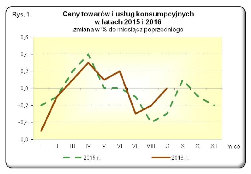 Według szacunków GUS, ceny dóbr i usług konsumpcyjnych we wrześniu 2016 r. pozostały na poziomie notowanym w sierpniu 2016 r. W porównaniu z wrześniem 2015 r. były zaś niższe o 0,5%. Dane są zgodne z wcześniejszym szybkim szacunkiem GUS.
