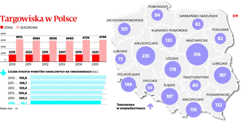 O ile targowisk przybywa, o tyle kupców, którzy oferują na nich swoje towary, sukcesywnie ubywa. Taka sytuacja jest widoczna od co najmniej kilku lat. Obecnie regularnie biznes na targowisku prowadzi już tylko nieco ponad 98 tys. przedsiębiorców. Jeszcze rok temu było ich o 1,6 proc. więcej. Natomiast w ciągu ostatnich pięciu lat ubyło ich 7 proc. W 2010 r. na targowiskach działało bowiem 106 tys. punktów handlowych.