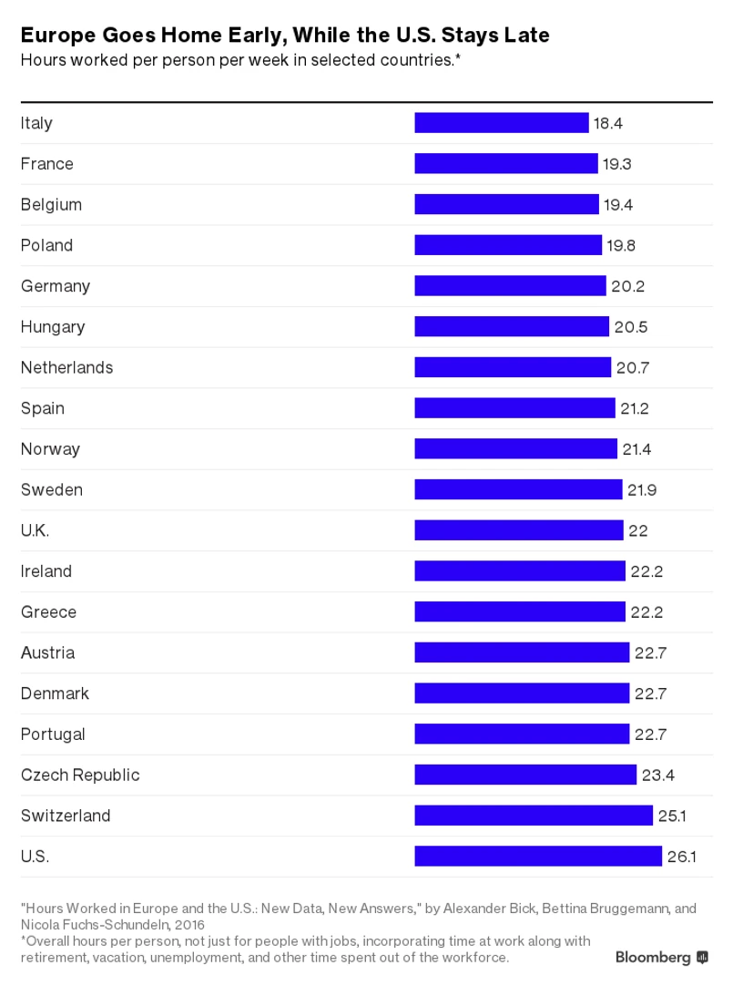 Z właśnie opublikowanego raportu ekonomistów Alexandra Bicka z Arizona State University, Bettiny Bruggemann z McMaster University w Ontario oraz Nicoli Fuchs-Schundeln z Goethe University Frankfurto na temat liczby przepracowanych przez obywateli godzin wynika, że znacznie różni się ona pomiędzy poszczególnymi krajami.