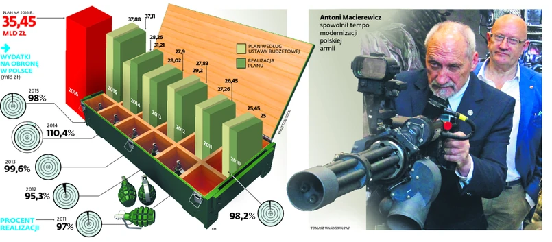 Jedynym postępowaniem, którego ekipa PiS nie tylko nie unieważniła, ale jednocześnie wdrożyła podczas niego z sukcesem własny pomysł, jest zakup samolotów dla najważniejszych osób w państwie. W ubiegły piątek złożono oferty na małe samoloty, a do przetargu na średnie zgłosiło się czterech oferentów. Zapewne niebawem będzie można te przetargi rozstrzygnąć i będzie to zdecydowany krok do przodu. Ale to zaledwie listek figowy, który nie przesłoni tego, że jak na razie w ministerstwie trzymanym żelazną ręką przez Antoniego Macierewicza stosunkowo łatwo duże postępowania zakupowe zamyka się bez rozstrzygnięcia. O ile jeszcze na początku urzędowania podpisano kilka umów w dużej mierze przygotowanych przez poprzedników (modernizacja czołgów Leopard, zestawy przeciwlotnicze Poprad, moździerze samobieżne Rak), o tyle teraz takich projektów już nie ma. Do poważnego ryzyka niewydania pieniędzy zaplanowanych na modernizację sił zbrojnych ministerstwu dochodzi jeszcze jeden problem – prawdopodobnie z końcem roku służbę zakończy szef Inspektoratu Uzbrojenia generał Adam Duda. To człowiek, który nadzoruje wszystkie procedury zakupowe. Być może jego następca będzie równie kompetentny, ale nie zmienia to faktu, że będzie potrzebował czasu, by oswoić się z nowym stanowiskiem. To procedur zakupowych w resorcie nie przyspieszy. ⒸⓅ