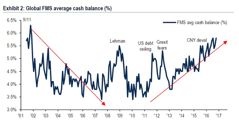 - Poziom gotówki w portfelach w tym miesiącu wskazuje na to, że inwestorzy mają „niedźwiedzie” nastroje, obawiając się rozpadu UE oraz wygranej Republikanów w wyścigu o Biały Dom – powiedział Michael Hartnett, główny strateg inwestycyjny America Merrill Lynch.