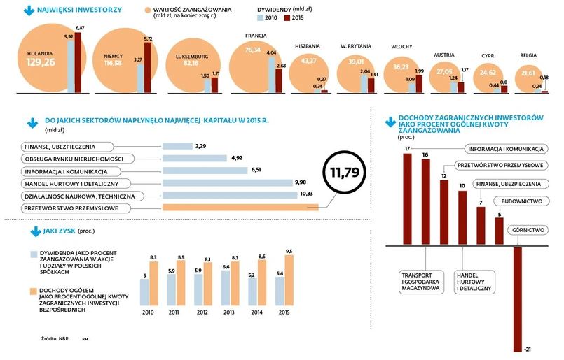 Jednak dochody zagranicznych właścicieli polskich firm nie spadły. Ogólna kwota, jaką dały im krajowe spółki córki, zwiększyła się do 67,5 mld zł. Była o 3,3 mld zł większa niż rok wcześniej. Każde zainwestowane u nas 100 tys. zł dało 9,5 tys. dochodu (rok wcześniej było to 8,6 proc.) – to najlepszy wynik przynajmniej w tej dekadzie.