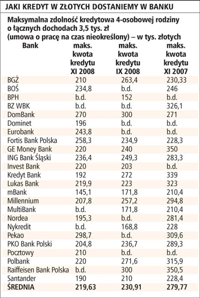 W ciągu ostatniego roku średnia wartość środków dostępnych w bankach dla przeciętnej rodziny zmniejszyła się o 27 proc. w wypadku kredytów złotowych i aż o 42 proc. w wypadku pożyczki w szwajcarskiej walucie. Innymi słowy, aby zachować zdolność kredytową z ubiegłego roku, przeciętny Kowalski powinien teraz zarabiać o około 1/3 więcej. Tymczasem według Głównego Urzędu Statystycznego w ostatnim roku nasze średnie zarobki zwiększyły się o 9,8 proc., do 3241 zł. Taki wzrost płac to zdecydowanie za mało, by utrzymać zdolność kredytową na ubiegłorocznym poziomie.