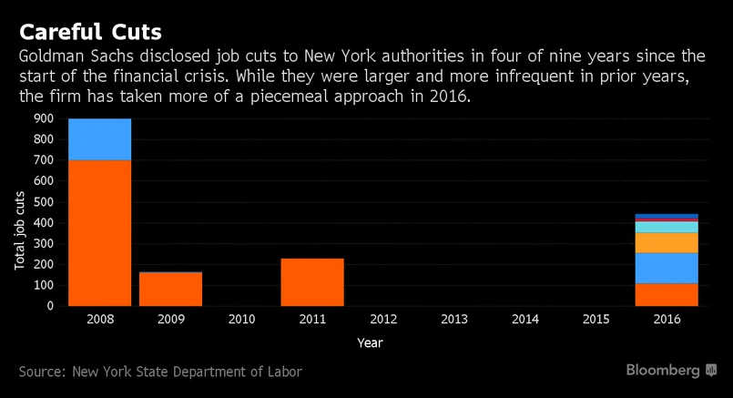Z powiadomień jakie dostarczył Goldman wynika, że w tym roku zamierza łącznie zwolnić setki zatrudnionych, co oznacza największe okrojenie załogi od osławionego 2008 roku. Strategia Goldman Sachsa znacznie różni się od tej, jaką stosuje na przykład Morgan Stanley – jednorazowego zwalniania dużej liczby osób.